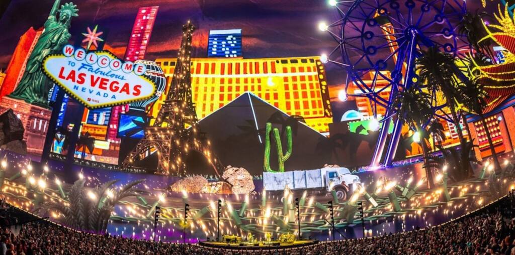 The first visual component showed a delivery truck traversing the country with landmarks like the St. Louis Arch appearing along the way to its arrival on the Las Vegas strip and final destination at the Sphere.