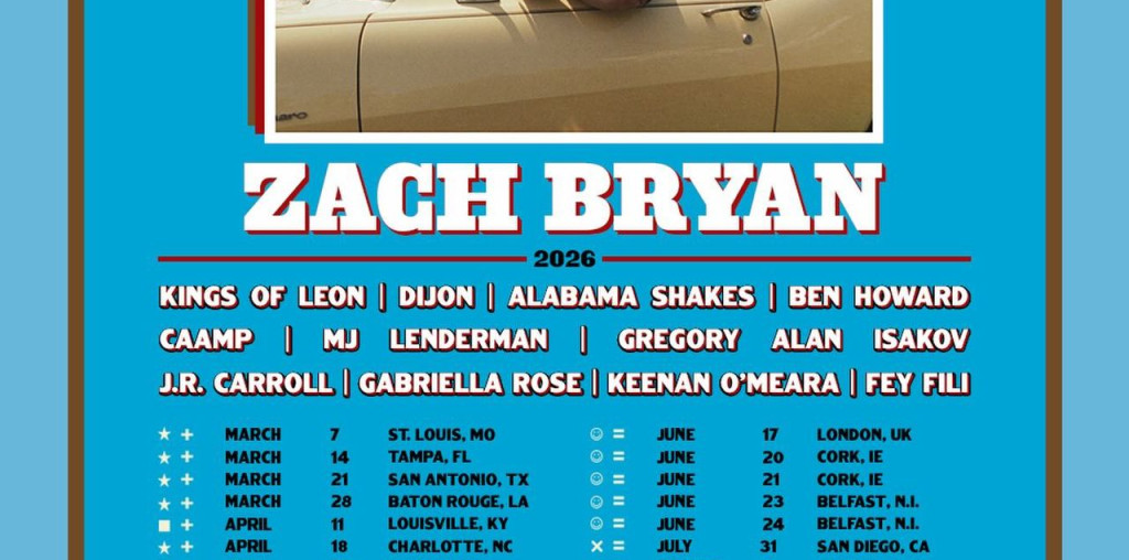 Zach Bryan has announced a 2026 tour that features support from MJ Lenderman, Dijon, Alabama Shakes, Kings of Leon, and others. The country superstar’s With Heaven on Tour begins in the United States in March. Bryan will then perform across Europe and the United Kingdom, before returning to North America in July. See the tour dates below.